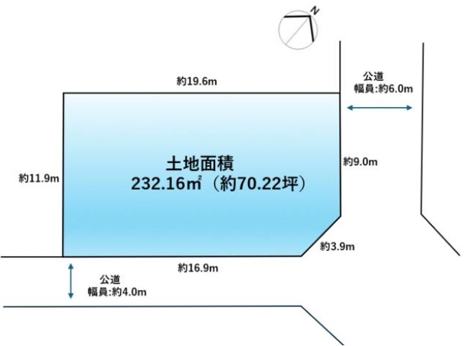 ・接道:南東約4mに約16.9m接道、北東約6mに約9m接道